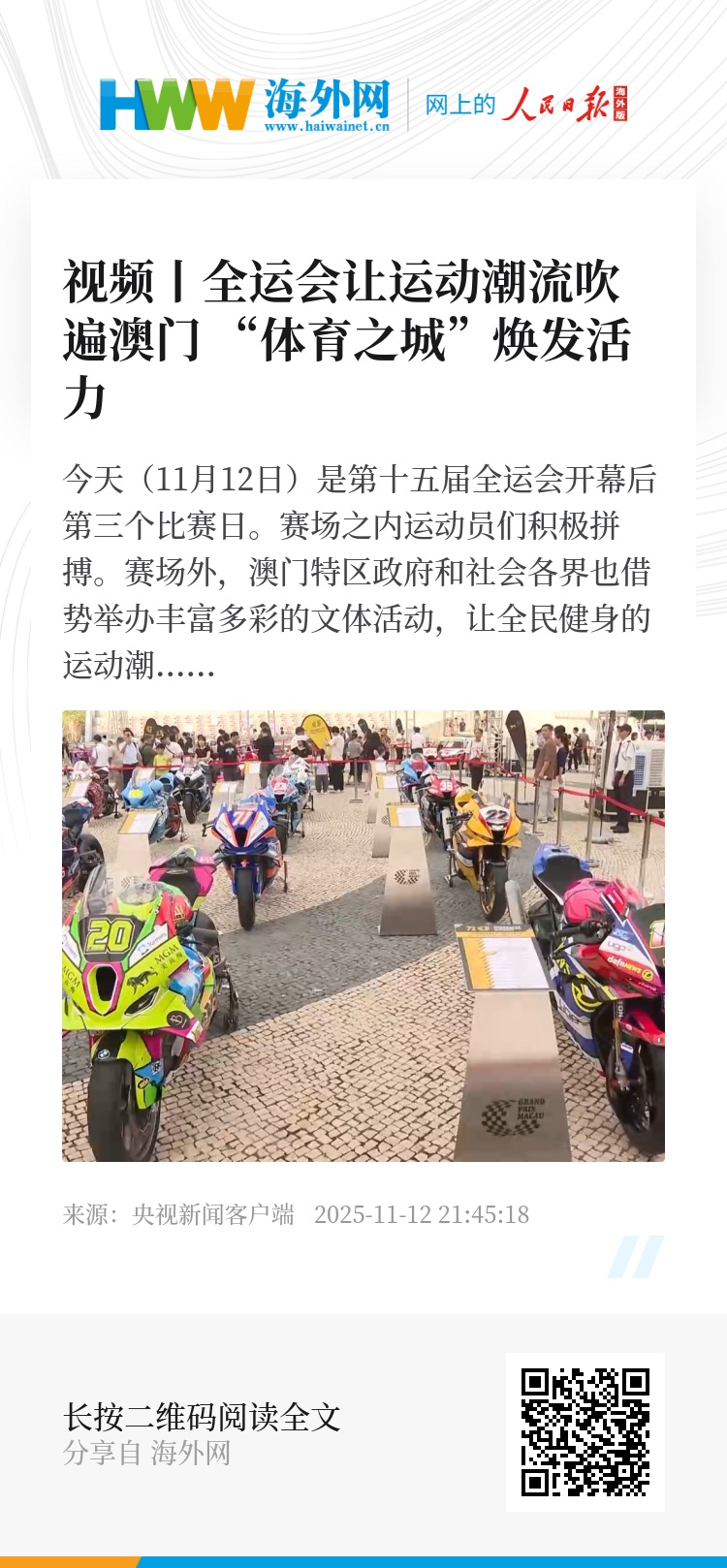 本届全运会期间,澳门历史悠久的格兰披治大赛车将于11月13日至16日同期举行,“体育之城”的“双赛”联动,让这座多元荟萃的城市,更加充满生机与活力。