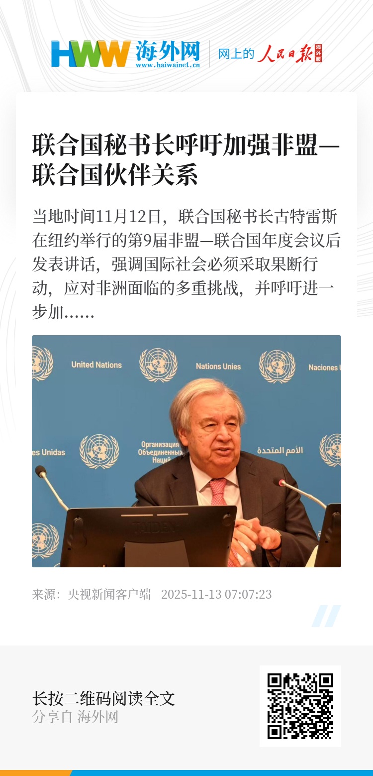 当地时间11月12日,联合国秘书长古特雷斯在纽约举行的第9届非盟—联合国年度会议后发表讲话,强调国际社会必须采取果断行动,应对非洲面临的多重挑战,并呼吁进一步加强联合国与非洲联盟之间的伙伴关系。