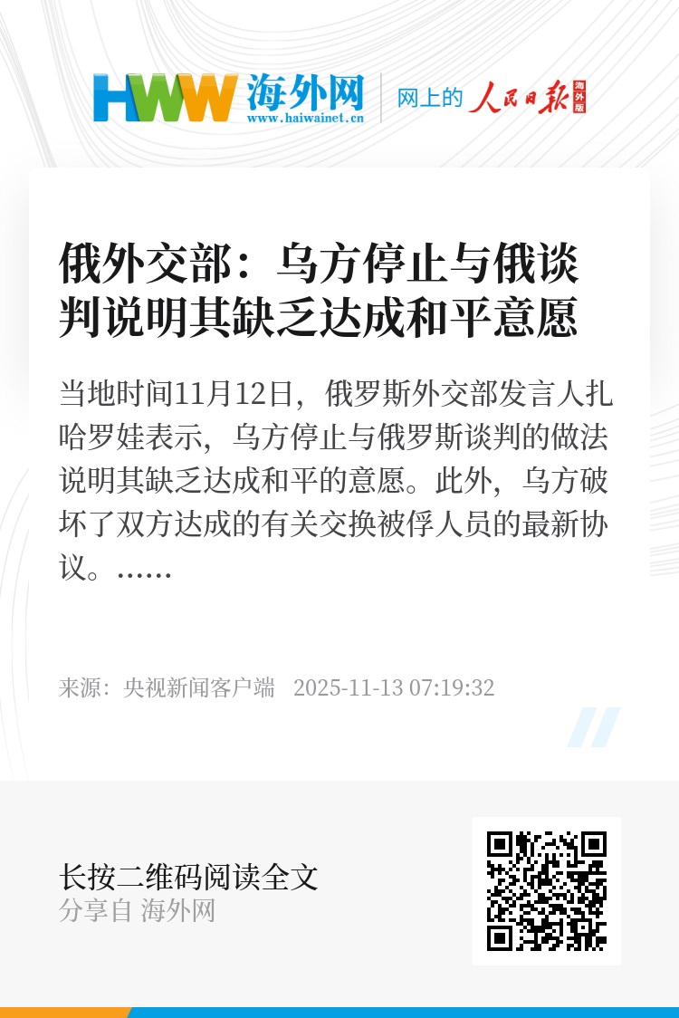 当地时间11月12日,俄罗斯外交部发言人扎哈罗娃表示,乌方停止与俄罗斯谈判的做法说明其缺乏达成和平的意愿。此外,乌方破坏了双方达成的有关交换被俘人员的最新协议。在达成的1200名应被交换人员中,已交换的数量不足30%。