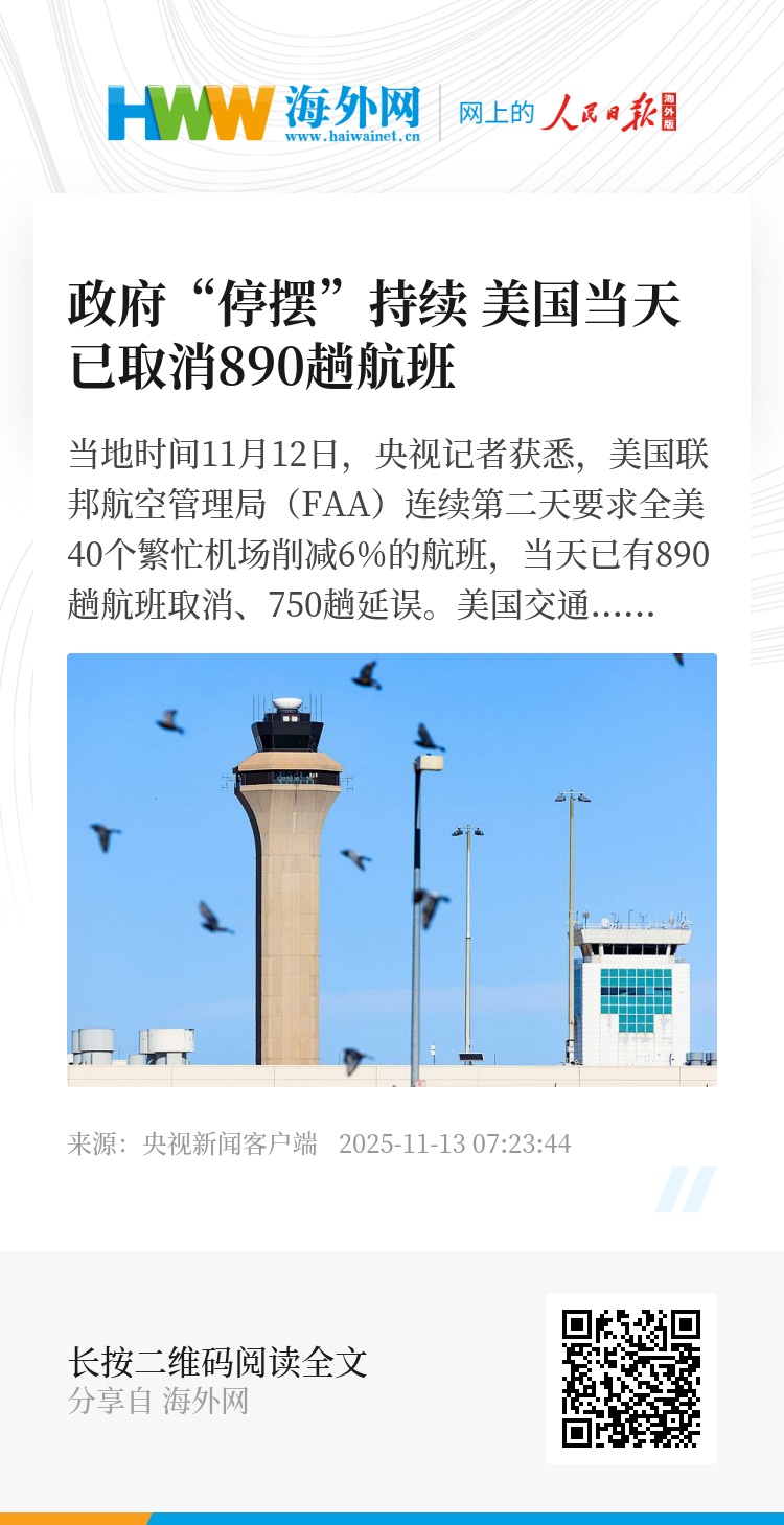 当地时间11月12日,央视记者获悉,美国联邦航空管理局(FAA)连续第二天要求全美40个繁忙机场削减6%的航班,当天已有890趟航班取消、750趟延误。
