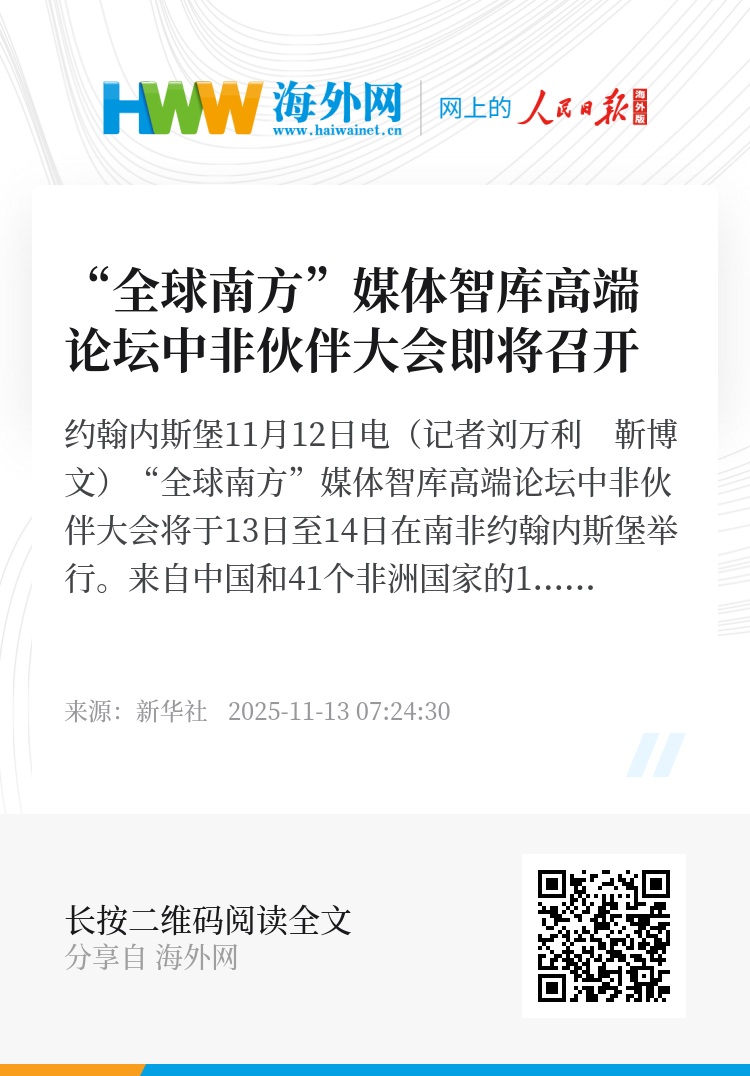 新华社约翰内斯堡11月12日电(记者刘万利 靳博文)“全球南方”媒体智库高端论坛中非伙伴大会将于13日至14日在南非约翰内斯堡举行。来自中国和41个非洲国家的160余家主流媒体、智库、政府部门等机构及非洲联盟(非盟)的200余名代表,将聚焦“全球治理体系变革:中非合作的新角色与新使命”主题开展广泛交流。