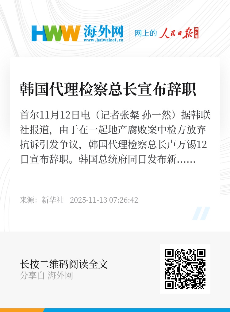 新华社首尔11月12日电(记者张粲 孙一然)据韩联社报道,由于在一起地产腐败案中检方放弃抗诉引发争议,韩国代理检察总长卢万锡12日宣布辞职。