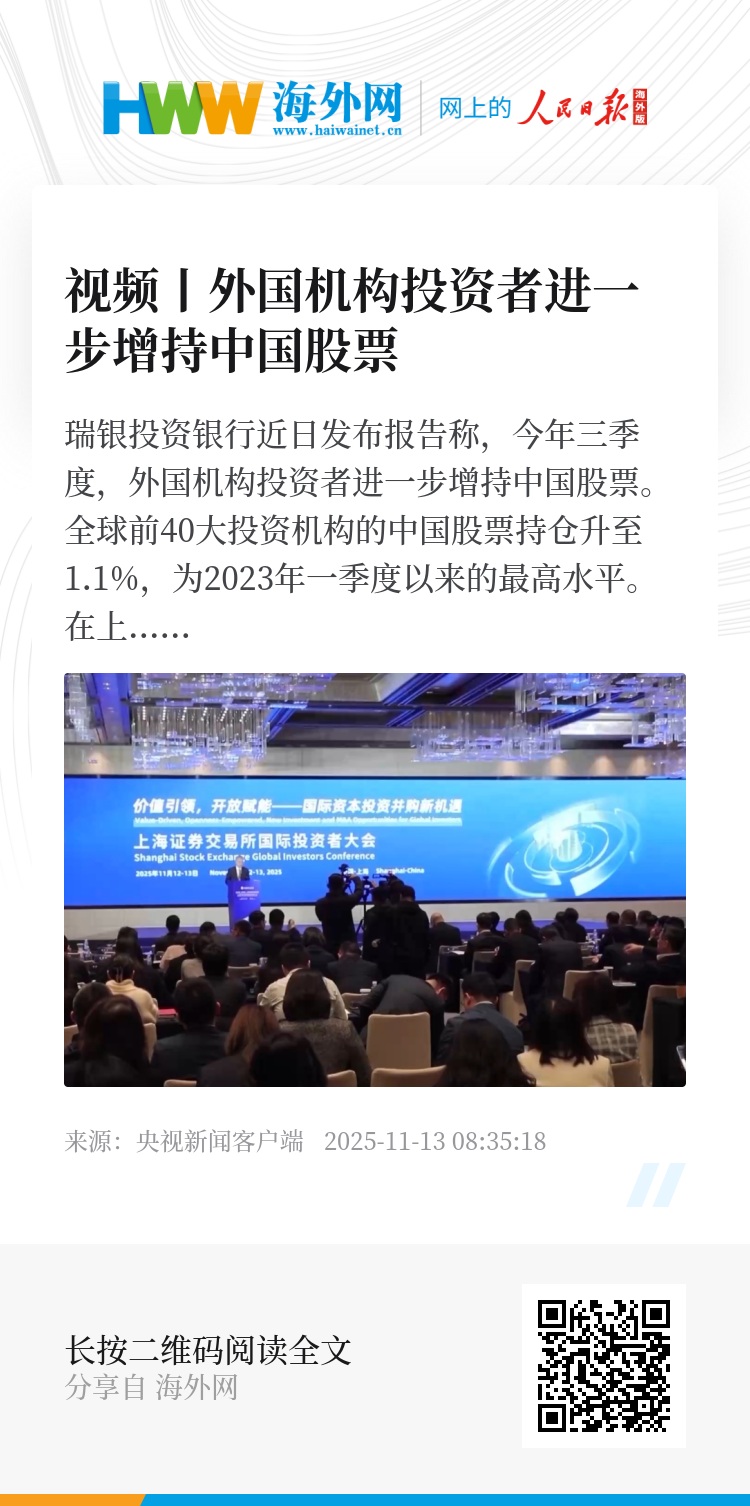 瑞银投资银行近日发布报告称,今年三季度,外国机构投资者进一步增持中国股票。全球前40大投资机构的中国股票持仓升至1.1%,为2023年一季度以来的最高水平。