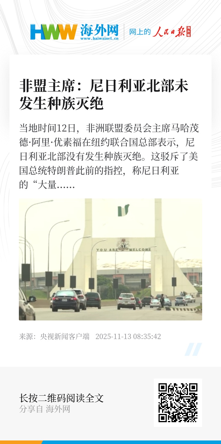 当地时间12日,非洲联盟委员会主席马哈茂德·阿里·优素福在纽约联合国总部表示,尼日利亚北部没有发生种族灭绝。这驳斥了美国总统特朗普此前的指控,称尼日利亚的“大量”基督徒遭到杀害。优素福表示,发表此类言论前请三思,极端组织“博科圣地”的首批受害者是穆斯林,而不是基督徒。