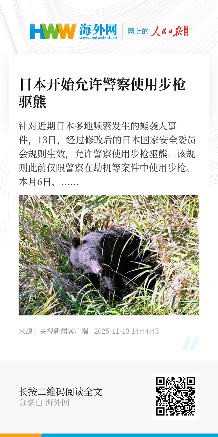 该规则此前仅限警察在劫机等案件中使用步枪。本月6日,日本警察厅修改了相关规则。自11月6日起,日本警方向熊袭人事件频发的岩手县和秋田县派遣其他地区的警力,与当地猎友会等开展联合训练,以掌握熊的习性及要害部位。