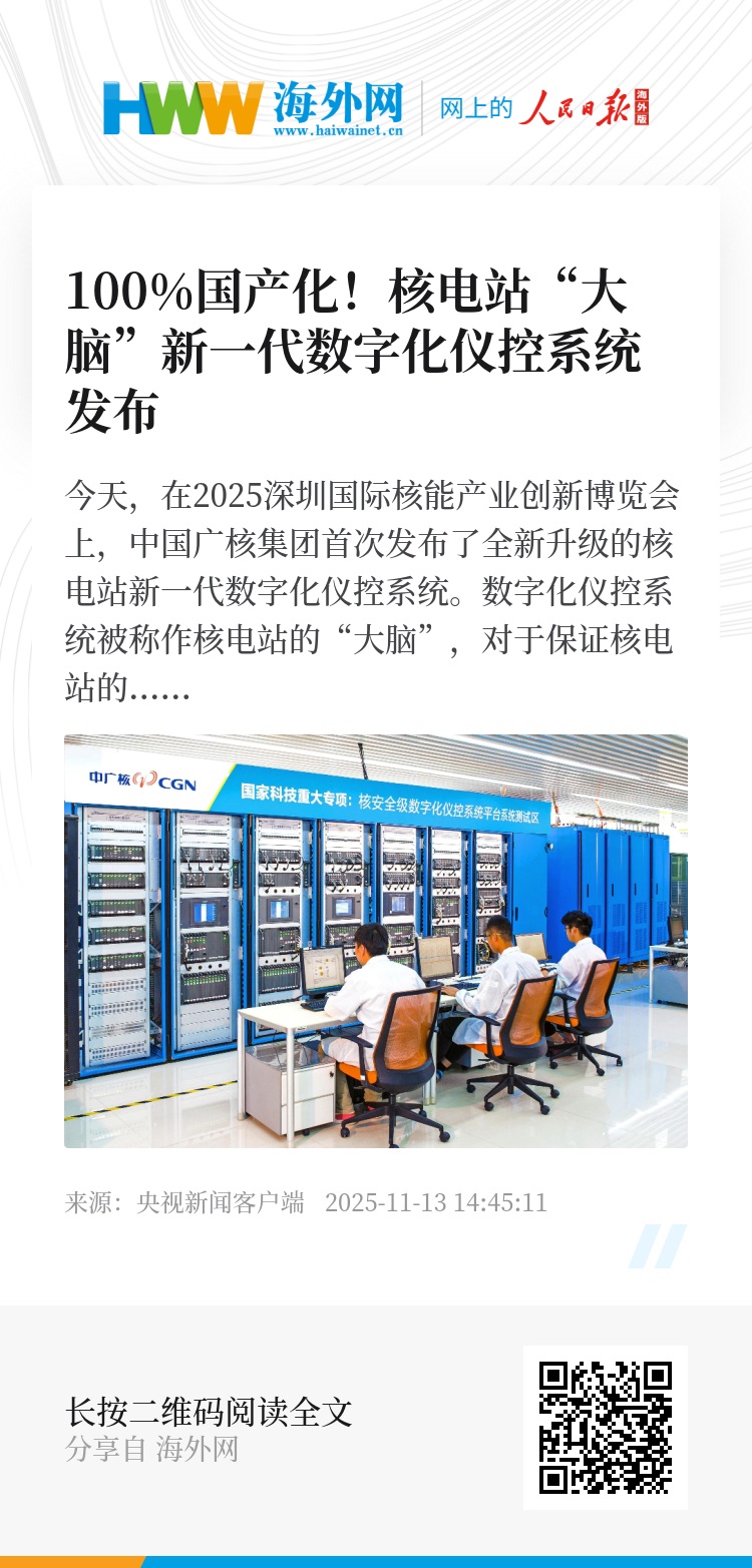 中广核数字科技有限公司董事长孙永滨介绍,新一代核安全级数字化仪控系统,也就是给核电站装上了100%国产化的超级智慧“大脑”,从硬件包括芯片到软件,包括操作系统嵌入式软件和通信软件,完全自主研发,实现了数字大脑中国造。