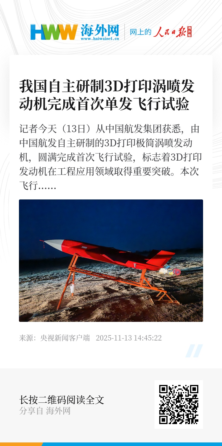 记者今天(13日)从中国航发集团获悉,由中国航发自主研制的3D打印极简涡喷发动机,圆满完成首次飞行试验,标志着3D打印发动机在工程应用领域取得重要突破。