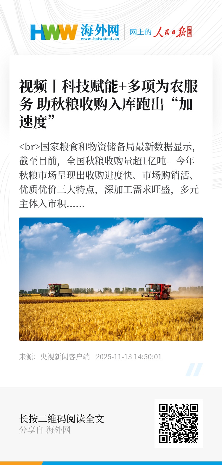 国家粮食和物资储备局最新数据显示,截至目前,全国秋粮收购量超1亿吨。今年秋粮市场呈现出收购进度快、市场购销活、优质优价三大特点,深加工需求旺盛,多元主体入市积极性高。