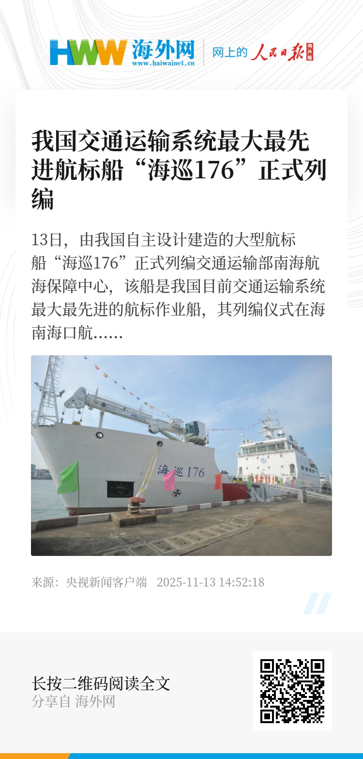 13日,由我国自主设计建造的大型航标船“海巡176”正式列编交通运输部南海航海保障中心,该船是我国目前交通运输系统最大最先进的航标作业船,其列编仪式在海南海口航保工作船码头举行。