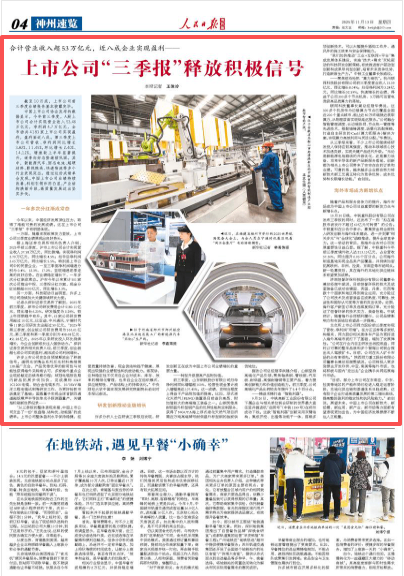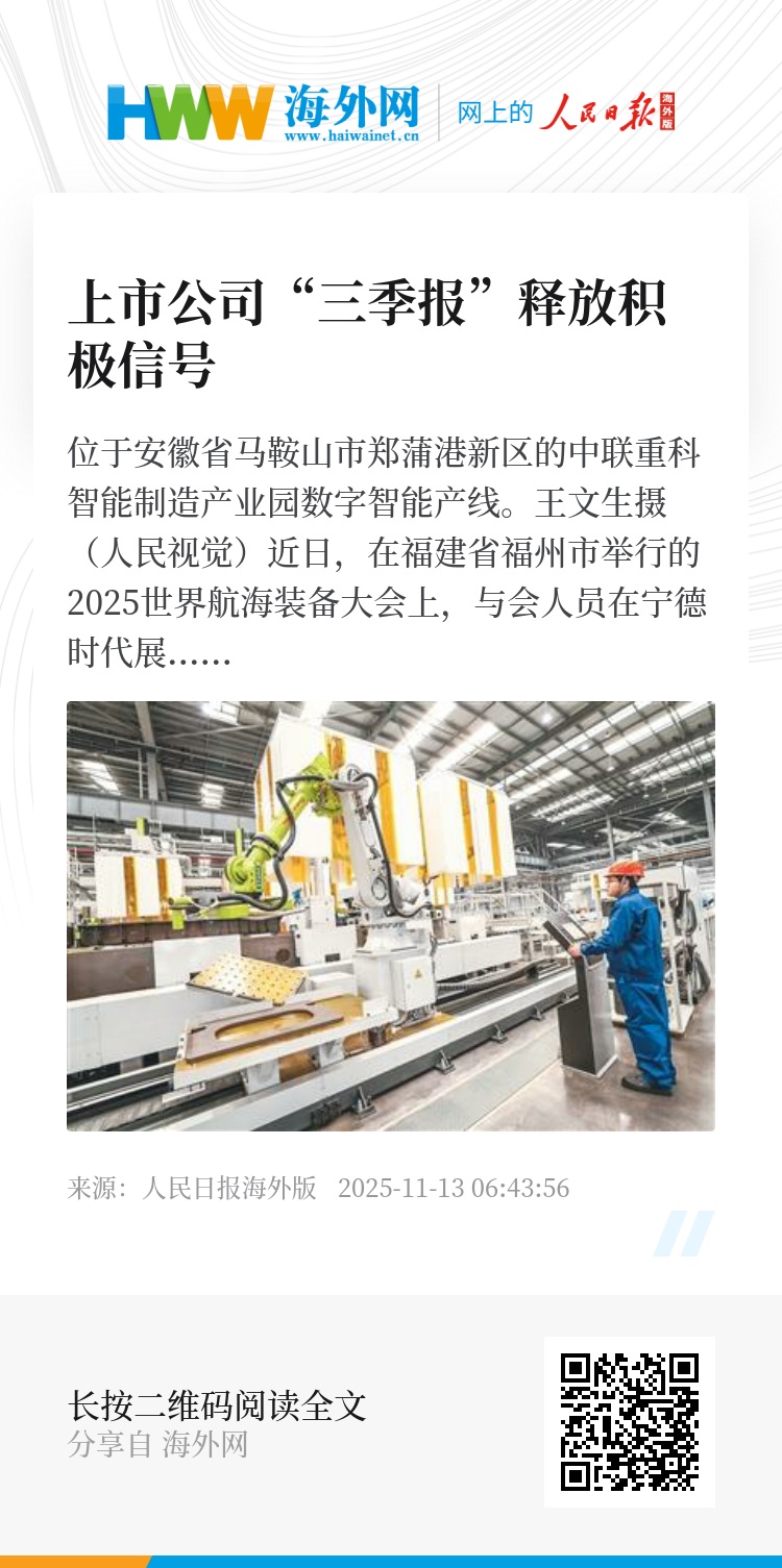 中国上市公司协会发布的数据显示,今年前三季度,A股上市公司合计实现营业收入53.46万亿元,净利润4.7万亿元,全市场共4183家上市公司实现盈利,盈利面近八成。第三季度上市公司营收、净利润同比增长3.82%、11.45%,环比增长2.40%、14.12%,增速较上半年显著提升,逐季向好态势继续巩固。其中,新能源汽车、固态电池、超硬材料、影视院线、快递物流等多个行业表现突出。透过这份成绩单会发现,中国上市公司业绩持续改善,科创引领作用凸显,产业结构焕新升级,高质量发展迈出坚实步伐。
