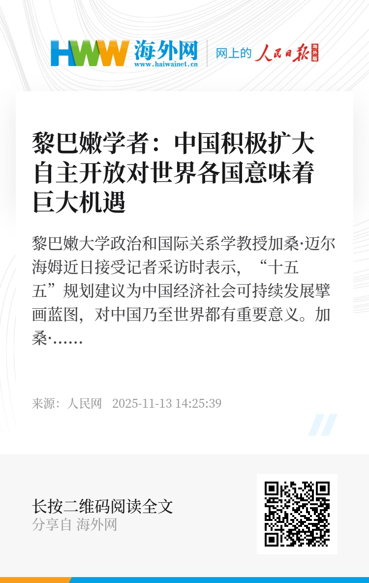 黎巴嫩大学政治和国际关系学教授加桑·迈尔海姆近日接受人民网记者采访时表示,“十五五”规划建议为中国经济社会可持续发展擘画蓝图,对中国乃至世界都有重要意义。