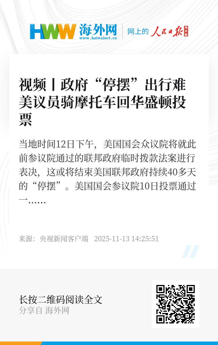 当地时间12日下午,美国国会众议院将就此前参议院通过的联邦政府临时拨款法案进行表决,这或将结束美国联邦政府持续40多天的“停摆”。美国国会参议院10日投票通过一项临时拨款法案。随后,数百名美国众议员开始陆续返回首都华盛顿。面对政府“停摆”导致的出行难题,有国会议员选择自驾前往。