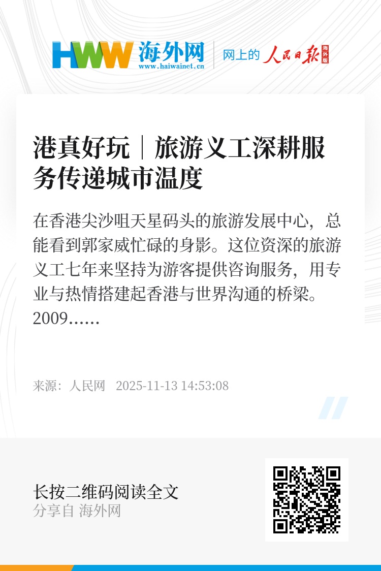 如今,像郭家威这样的旅游义工是香港重要的服务力量。他们如同城市的毛细血管,将包容开放的香港精神注入每一次服务。他们用专业与热情编织出香港最温暖的人文景观,向世界展示着这座城市的魅力与温度。(马滢滢 唐宋 曹欣悦 张荣)