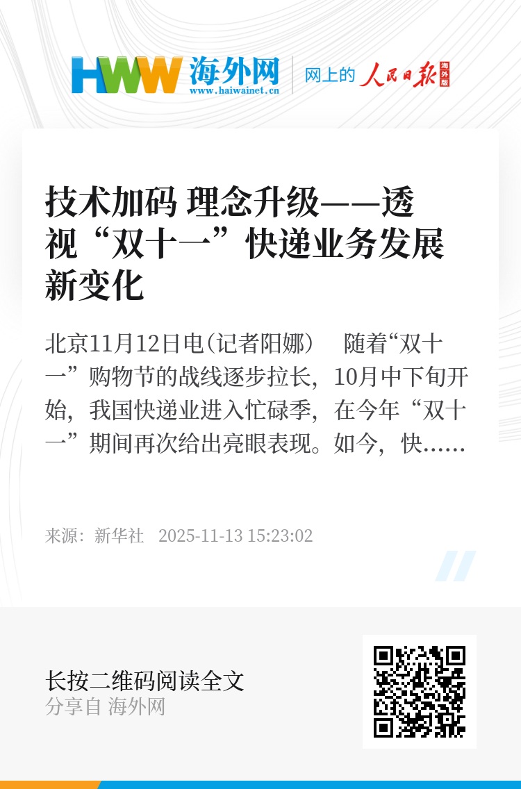 新华社北京11月12日电(记者阳娜) 随着“双十一”购物节的战线逐步拉长,10月中下旬开始,我国快递业进入忙碌季,在今年“双十一”期间再次给出亮眼表现。如今,快递业不仅解决了“货到人”的问题,更通过提质增效、转型升级展现行业发展新活力。技术加码、绿色低碳、理念升级等关键词诠释着当前我国快递业发展的多重变化。