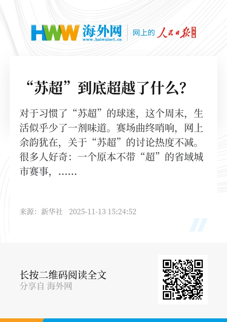 “苏超”之“超”,不仅是体育出圈,更传递出一个鲜明信号:当足球回归初心、文化找到载体、普通人成为主角,消费引擎便会凝聚起最动人、最澎湃的力量,为人民对美好生活的向往,为城市高质量发展注入不竭动能。(记者:杨丁淼、何磊静、陈圣炜)