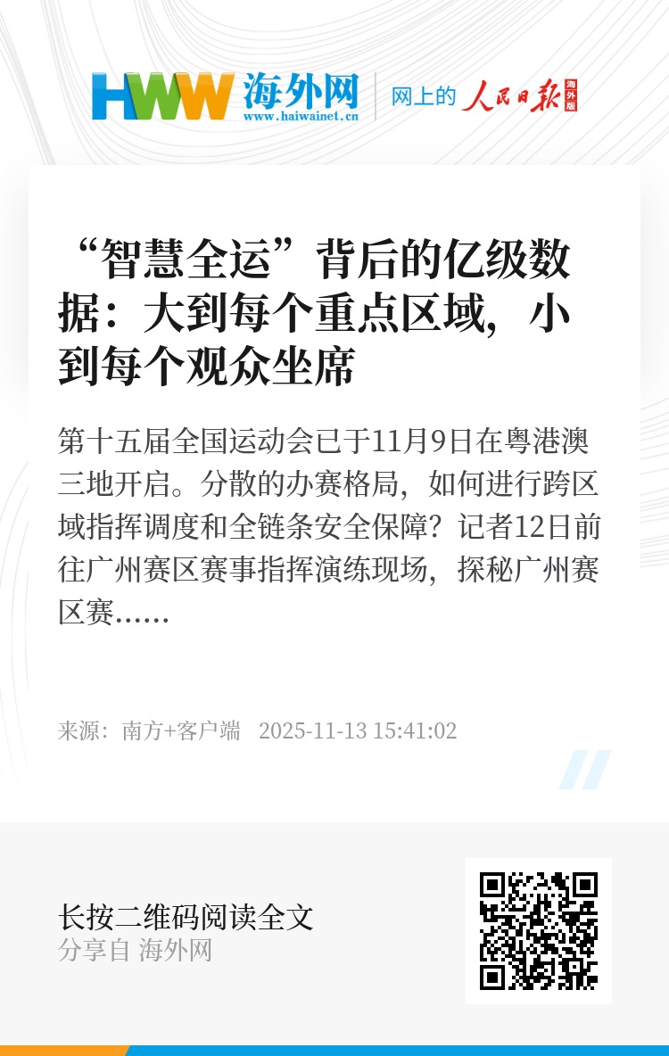 事实上,硬核技术植根于广州“办赛与办城并重”的深层布局,有赖于广州数十年智慧城市建设布局。“我们交付的不止是一套赛事保障系统,更是一套可复制、可推广的城市智慧治理范式。”黄津表示,全运会MOC指挥系统是“穗智管”10余个智能体之一,今后将复制到更多城市运行场景,推进跨部门、跨层级高效协同联动。