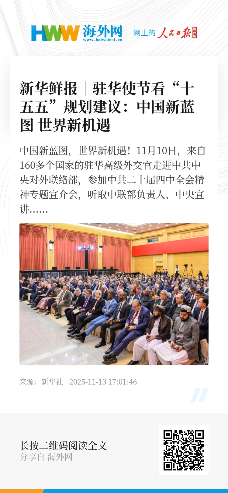 满怀期待,驻华使节们步入宣介会现场。宣讲专家介绍,中共二十届四中全会最重要的成果,是审议通过了“十五五”规划建议,对中国未来5年发展作出顶层设计和战略擘画。中方将积极扩大自主开放,推动贸易创新发展,拓展双向投资合作空间,推进高质量共建“一带一路”,为世界各国发展带来更多新的机遇。