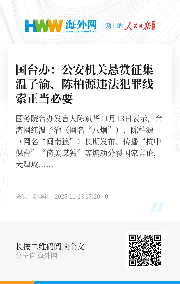 国务院台办发言人陈斌华11月13日表示,台湾网红温子渝(网名“八炯”)、陈柏源(网名“闽南狼”)长期发布、传播“抗中保台”“倚美谋独”等煽动分裂国家言论,大肆攻击、抹黑大陆惠台利民政策,欺凌、迫害在台大陆配偶和支持两岸关系和平发展的台湾同胞,充当“台独”打手帮凶,助纣为虐、影响恶劣。公安机关发布通告悬赏征集其违法犯罪线索,是依法惩治分裂国家、煽动分裂国家犯罪的具体行动,是回应两岸民众惩“独”呼声的正义之举,正当必要。