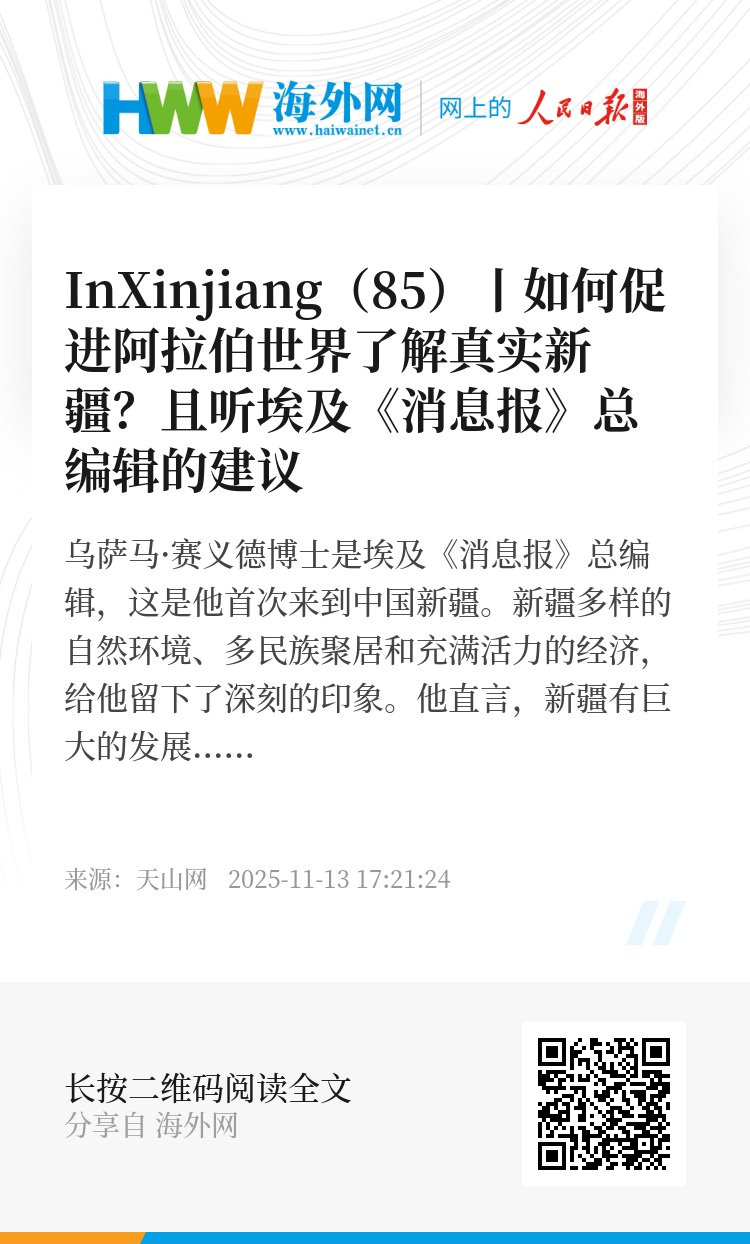 乌萨马·赛义德博士是埃及《消息报》总编辑,这是他首次来到中国新疆。新疆多样的自然环境、多民族聚居和充满活力的经济,给他留下了深刻的印象。他直言,新疆有巨大的发展潜力。