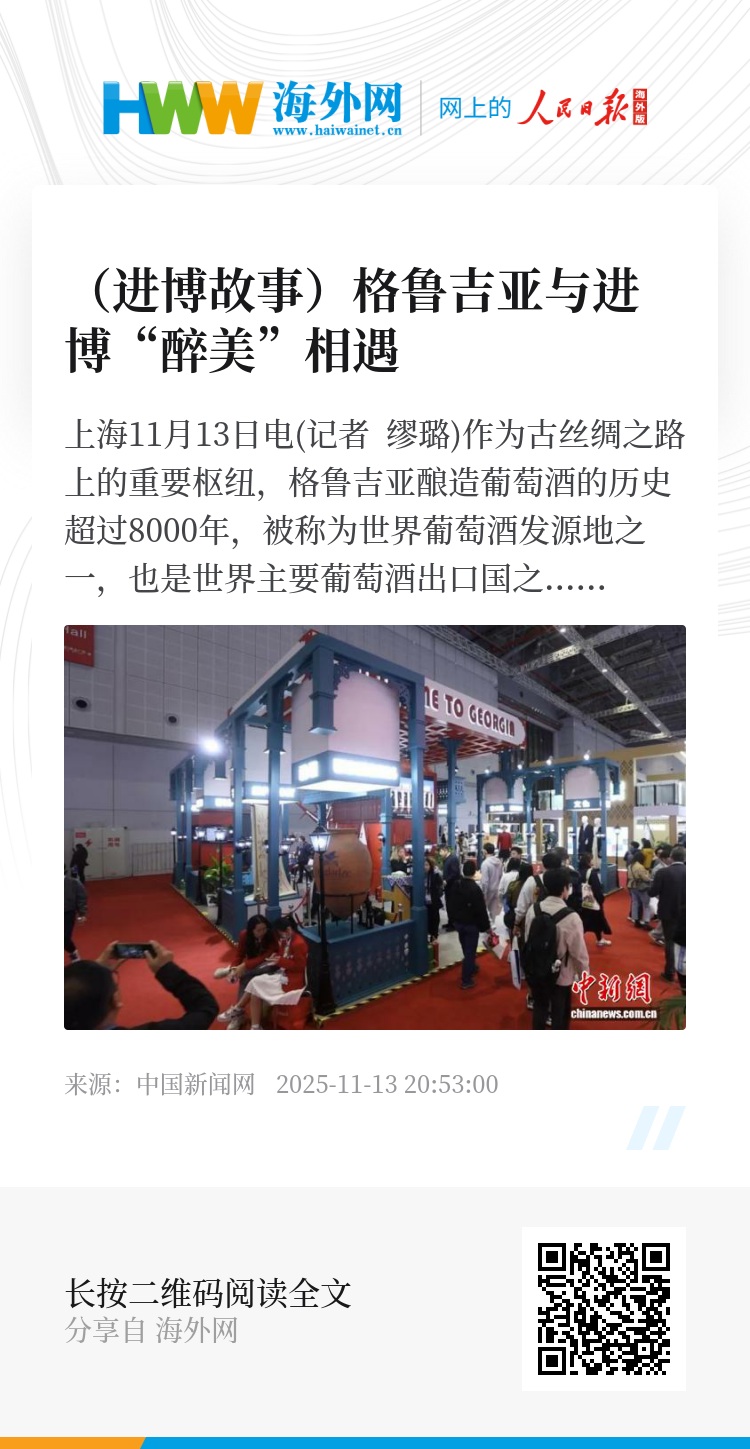 中新网上海11月13日电(记者 缪璐)作为古丝绸之路上的重要枢纽,格鲁吉亚酿造葡萄酒的历史超过8000年,被称为世界葡萄酒发源地之一,也是世界主要葡萄酒出口国之一。如今格鲁吉亚的葡萄酒香,借由进博会这一平台,飘向更广阔的市场。