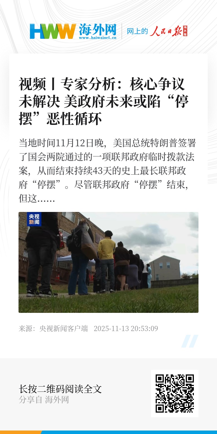 中国人民大学国际关系学院教授 刁大明:美国联邦政府关门“停摆”40多天之后,美国民主、共和两党最终实现妥协,得以暂缓危机。这种妥协本质上看还是两党在空前危机的压力下,做出的符合自身政治私利的妥协的决定。