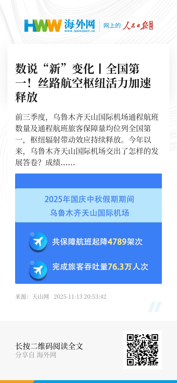 前三季度,乌鲁木齐天山国际机场通程航班数量及通程航班旅客保障量均位列全国第一,枢纽辐射带动效应持续释放。今年以来,乌鲁木齐天山国际机场交出了怎样的发展答卷?成绩是如何取得的?今天的《数说“新”变化》一起来看看。