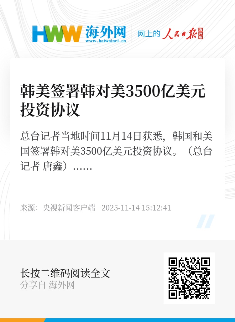 总台记者当地时间11月14日获悉,韩国和美国签署韩对美3500亿美元投资协议。(总台记者 唐鑫)