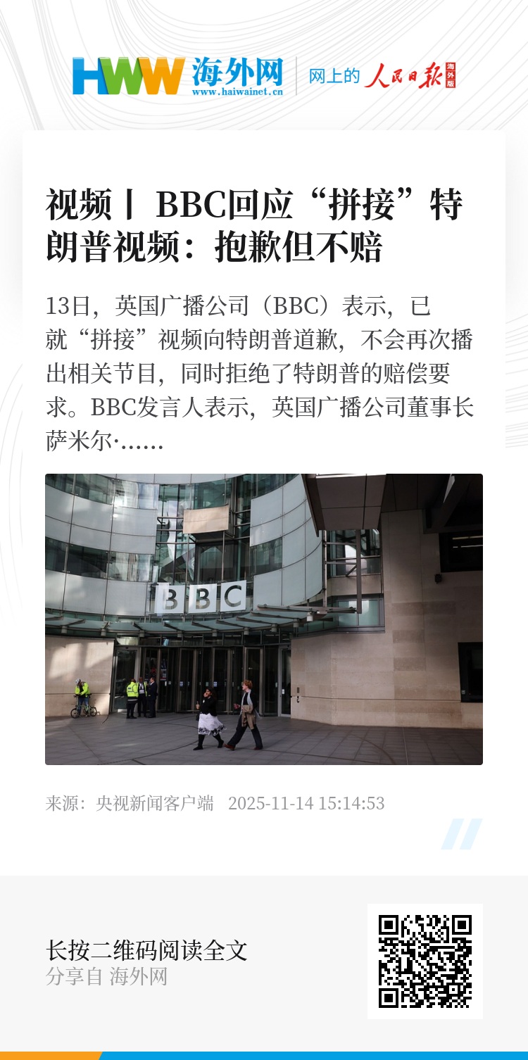 13日,英国广播公司(BBC)表示,已就“拼接”视频向特朗普道歉,不会再次播出相关节目,同时拒绝了特朗普的赔偿要求。