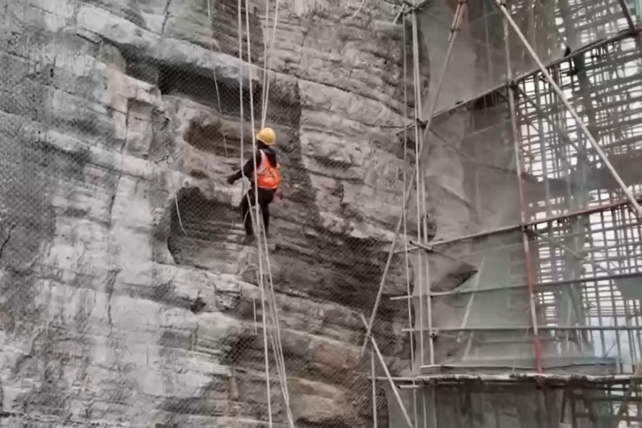 重庆市地矿集团南江勘测公司副总经理 王徐:目前正在做的是主动防护网的作业。主动防护网是先铺一层细网,将钢丝绳穿在铆环里面,横向穿过去,竖向穿过去,穿成一个方格状的一个东西固定住。