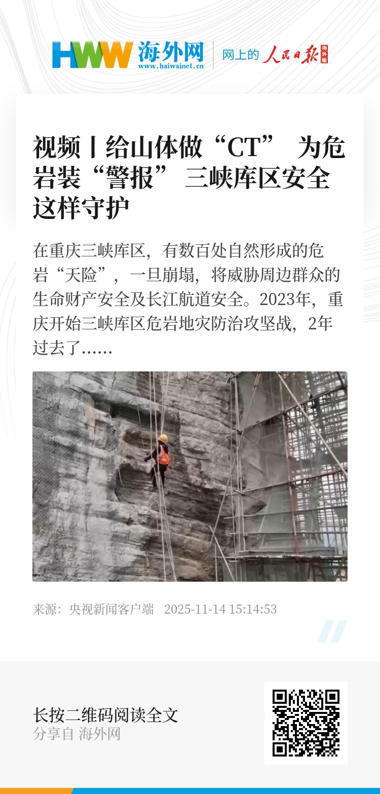 总台记者邓丽娟介绍,在治理危岩的同时,重庆也通过高科技手段,织起一张“天-空-地”协同的危岩智能防护网。借助北斗卫星给山体做CT扫描,山体位移可以精确到毫米级别。此外,工程人员还可以用无人机和物联网,对危岩形变和裂缝发展进行24小时不间断监测。