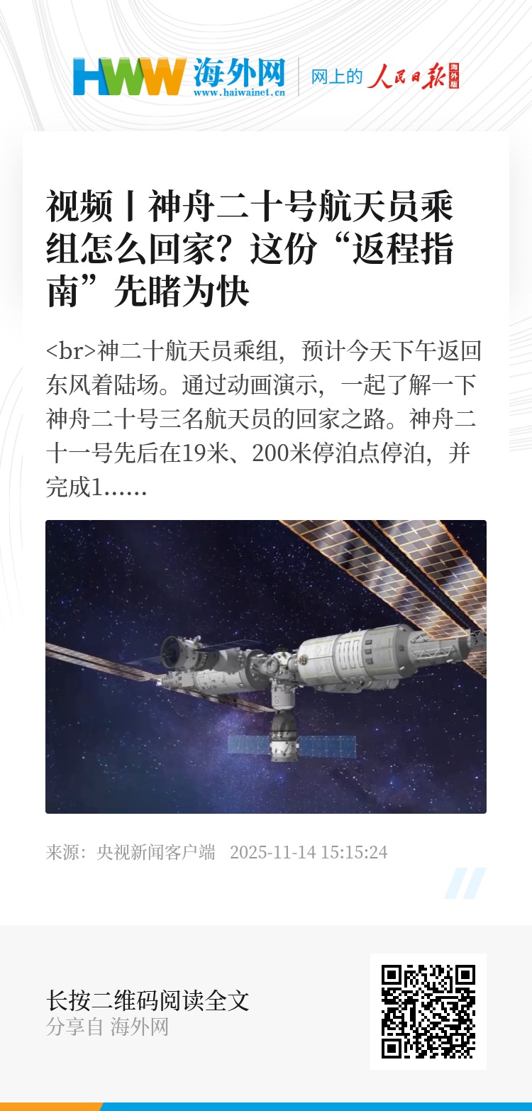 神二十航天员乘组,预计今天下午返回东风着陆场。通过动画演示,一起了解一下神舟二十号三名航天员的回家之路。