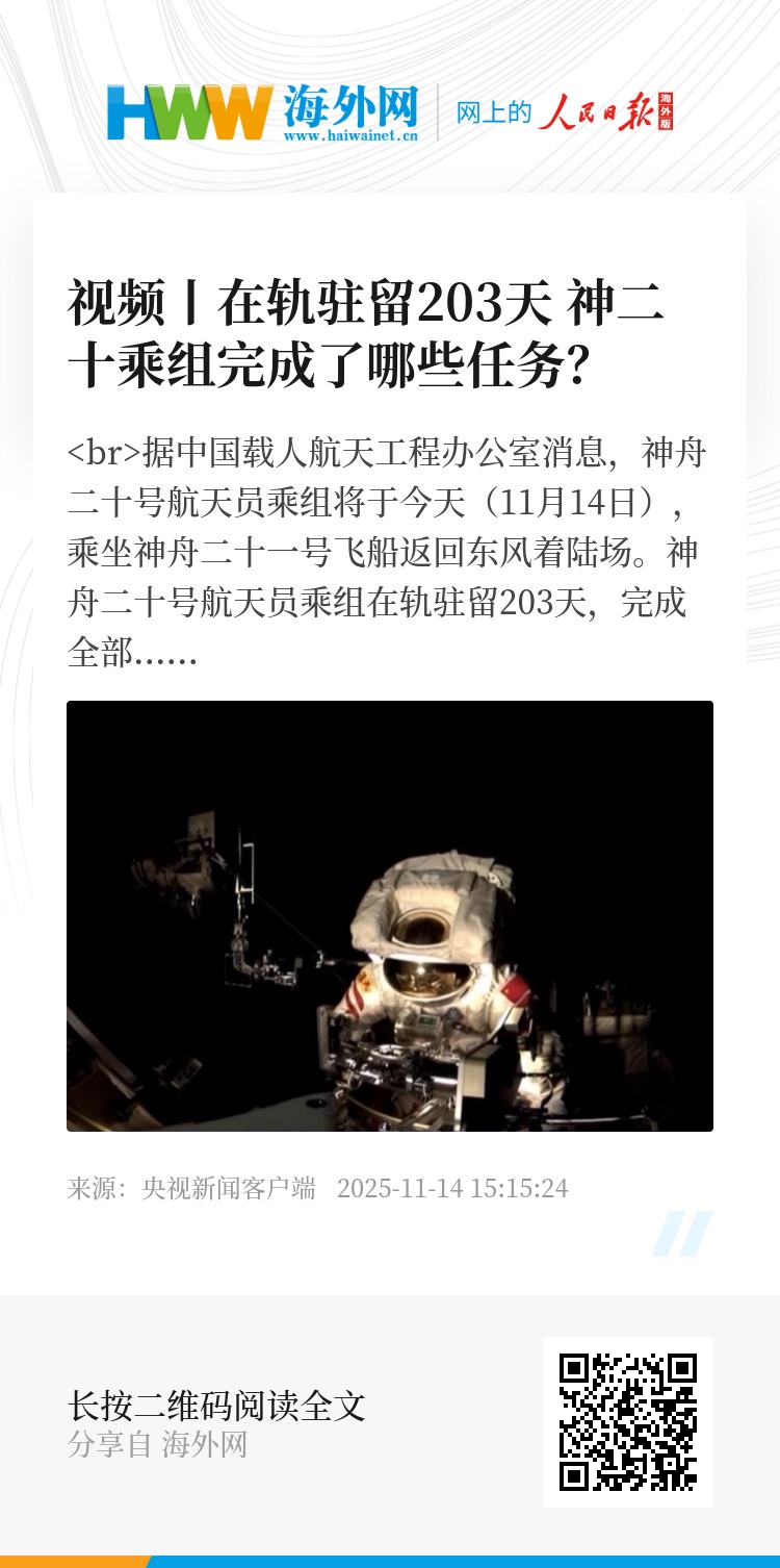 神舟二十号航天员乘组在轨驻留203天,完成全部既定任务,即将收获满满返回地球,他们这次太空出差具体都完成了哪些任务呢,一起来盘点一下。