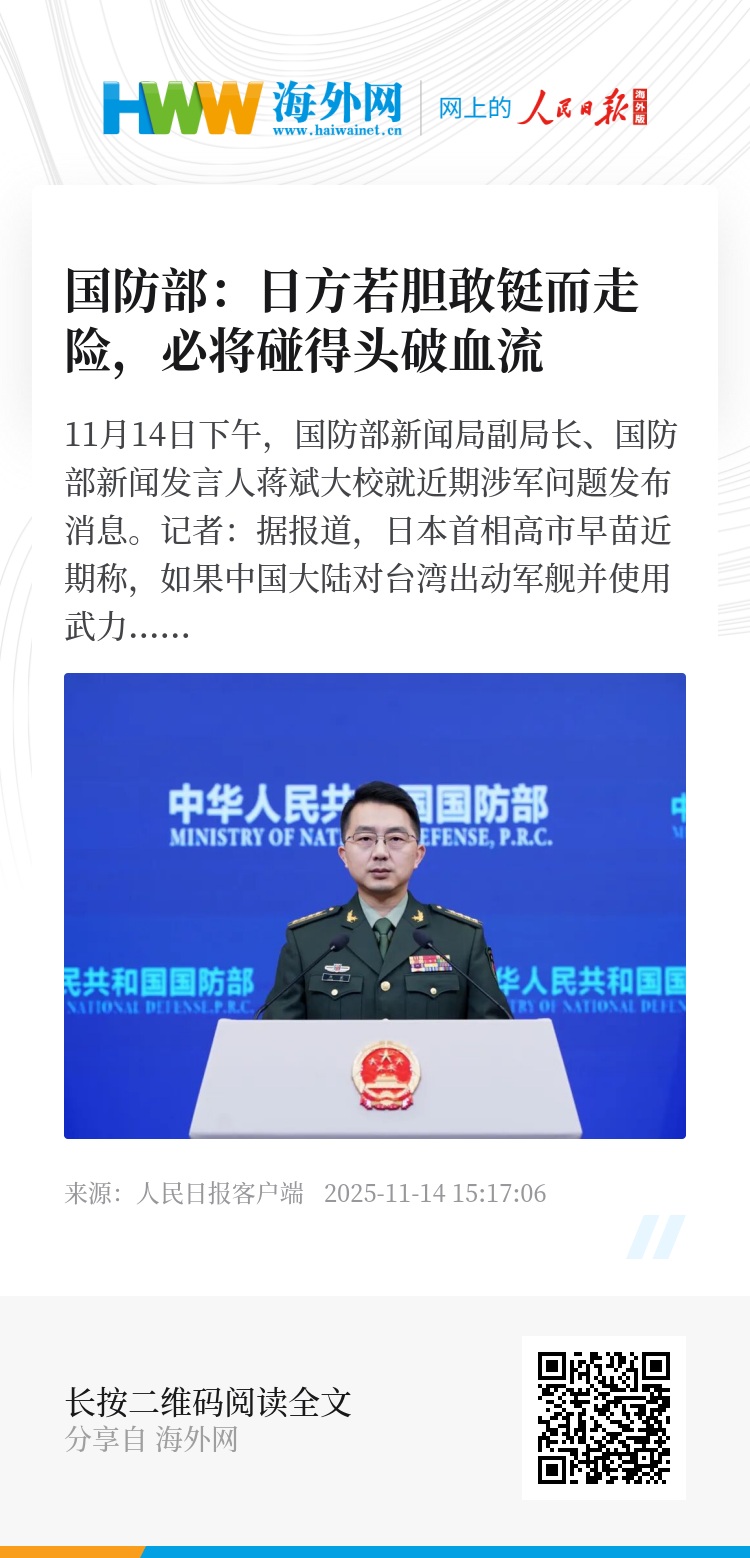 记者:据报道,日本首相高市早苗近期称,如果中国大陆对台湾出动军舰并使用武力,可能会构成“存亡危机事态”,自卫队将可以依法行使集体自卫权。请问发言人有何评论?