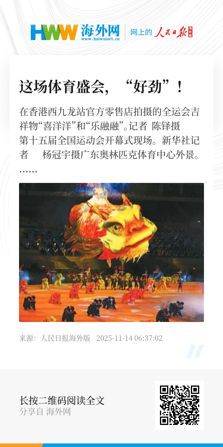 11月9日,第十五届全国运动会在广东广州拉开帷幕。这场充满激情的体育盛会是首次由粤港澳三地联合举办的全国运动会。赛场内,运动员们奋力拼搏;赛场外,网友们持续关注。连日来,十五运会的相关内容频频登上热搜,其中不少话题十分有趣。有网友点赞说“这场盛会‘好劲’(粤语“很厉害”)啊”。