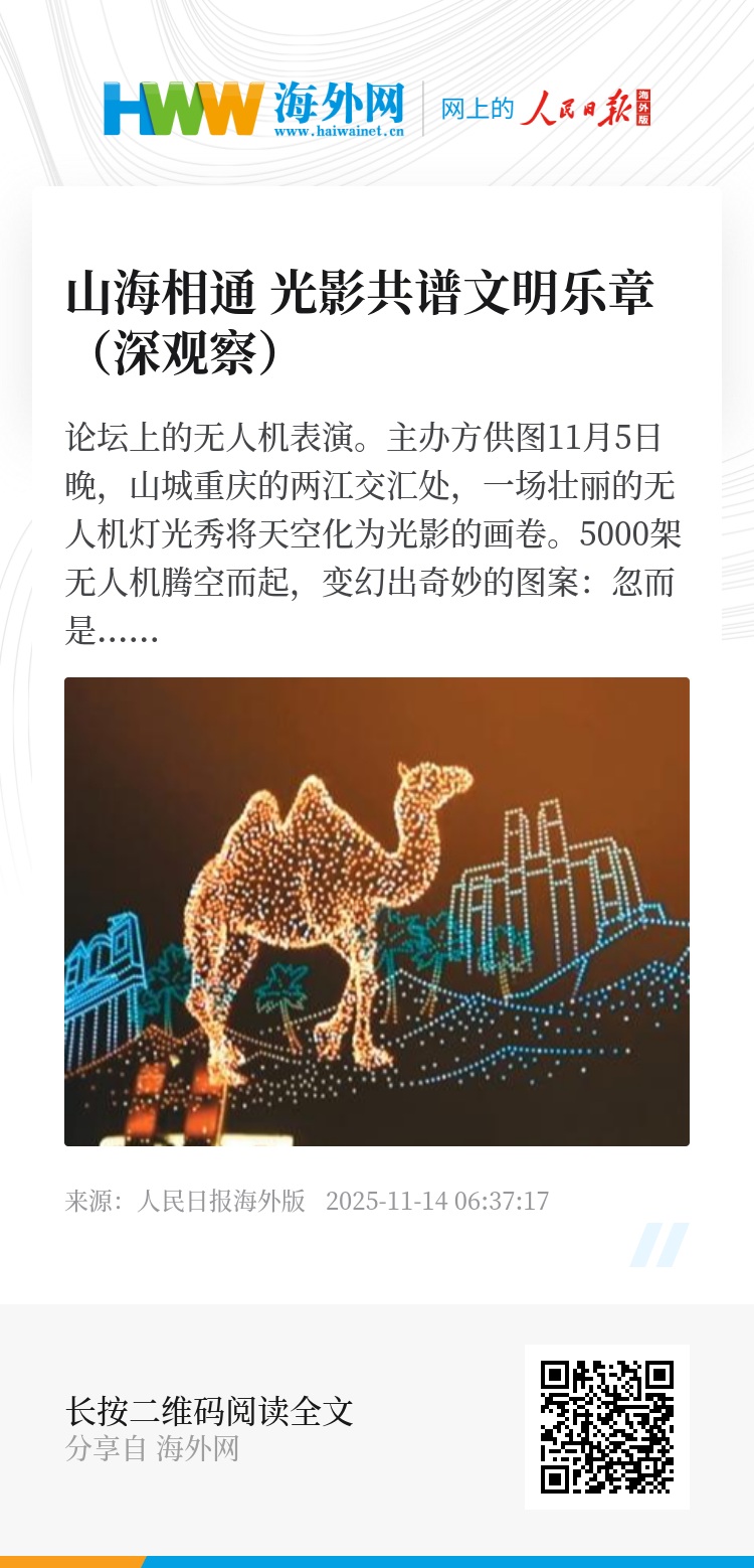这场无人机表演,是11月4日至6日在重庆举办的第七届中国—阿拉伯国家广播电视合作论坛的一个环节。论坛上,来自中国和16个阿拉伯国家、2个国际组织的约300位代表跨越山海,相聚一堂,围绕“中阿文明互鉴·视听创新共赢”的主题进行了深入研讨。这场盛会,既带来思想的交流,也促进了情感的融合。