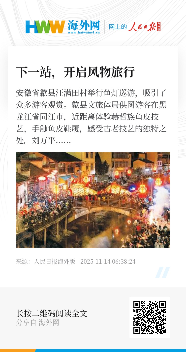 鱼灯是安徽省歙县的特色风物,也是延续了数百年的活态民俗,它不仅是非遗,更被视为“有温度的文化仪式”。其中,汪满田鱼灯已有600多年历史,每年正月十三到正月十六,鱼灯队巡游全村,为家家户户送上“年年有余”的祝福,也吸引了众多海内外游客的到来。今年春节期间,歙县接待游客112万人次,同比增长18.39%,旅游总花费10.87亿元,同比增长21.59%。