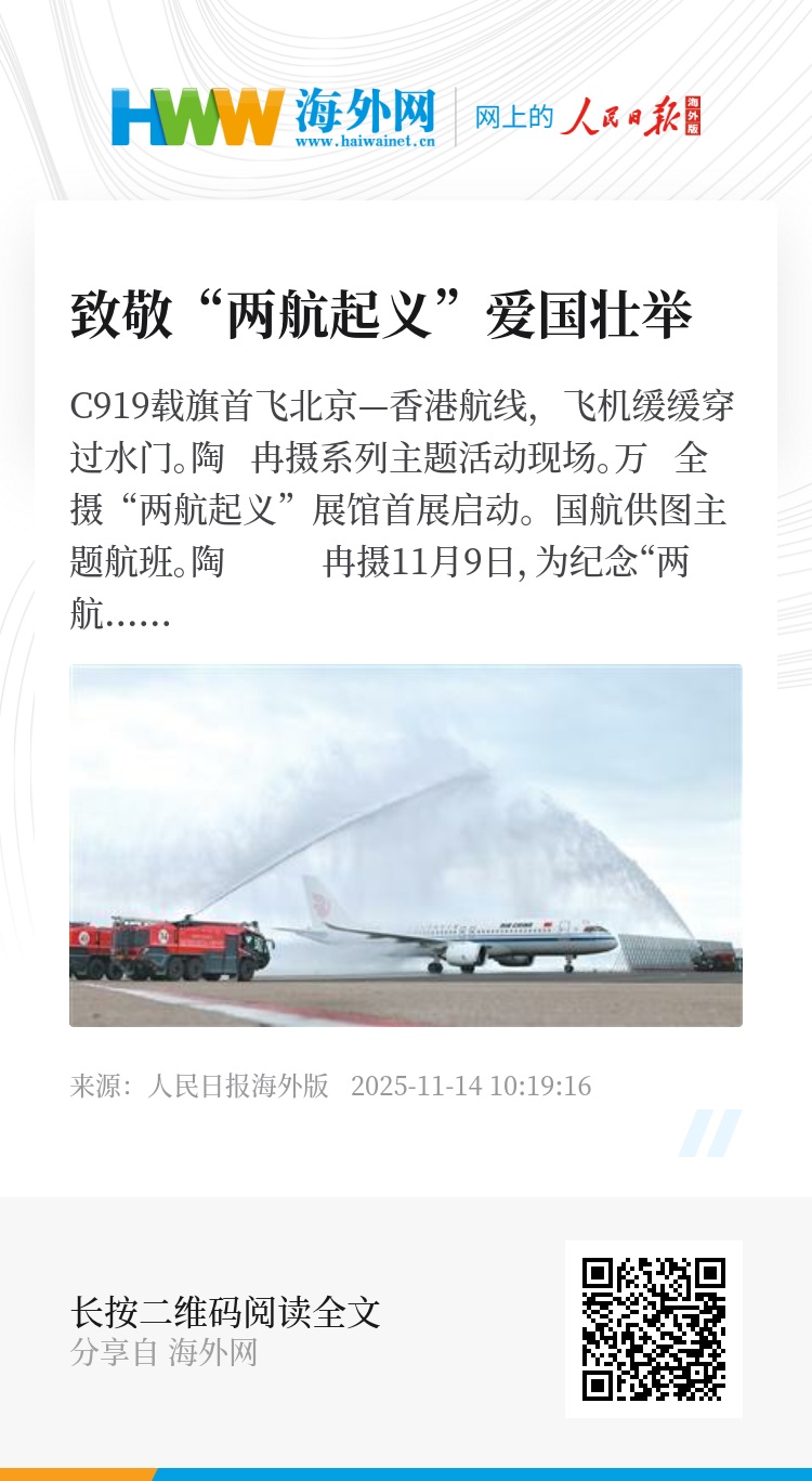 11月9日,为纪念“两航起义”76周年,传承弘扬爱国主义精神,中国航空集团有限公司(以下简称“中航集团”)举办“翼展爱国光辉 载旗荣耀北飞——国航C919重飞‘两航起义’北飞光辉航程”系列主题活动。此次活动通过国航C919重飞“两航起义”航线主题航班和天津“两航起义”展馆首展“空地联动”,追溯新中国民航事业的开端,致敬“两航起义”的爱国壮举,礼赞中国民航事业的先驱者与奠基人,生动呈现了新时代民航建设的跨越式发展。