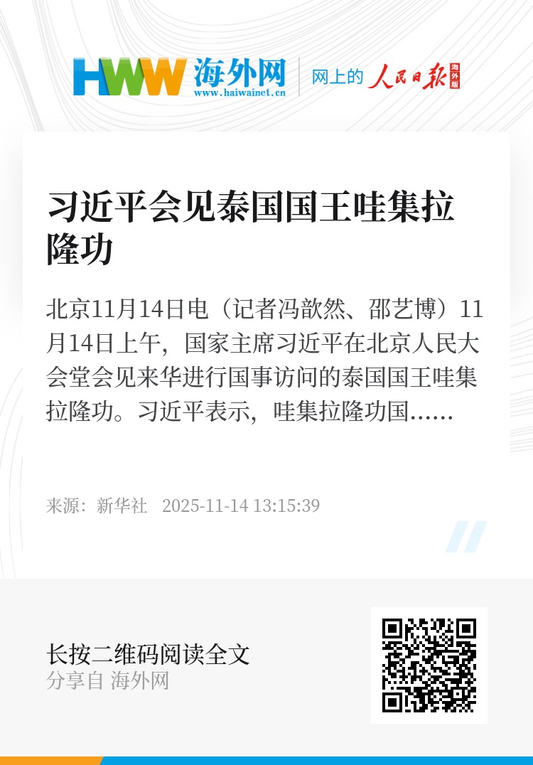 新华社北京11月14日电(记者冯歆然、邵艺博)11月14日上午,国家主席习近平在北京人民大会堂会见来华进行国事访问的泰国国王哇集拉隆功。