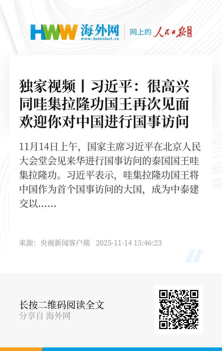 习近平表示,哇集拉隆功国王将中国作为首个国事访问的大国,成为中泰建交以来首位访华的泰国国王,充分体现了对中泰关系的高度重视和“中泰一家亲”的深厚情谊。