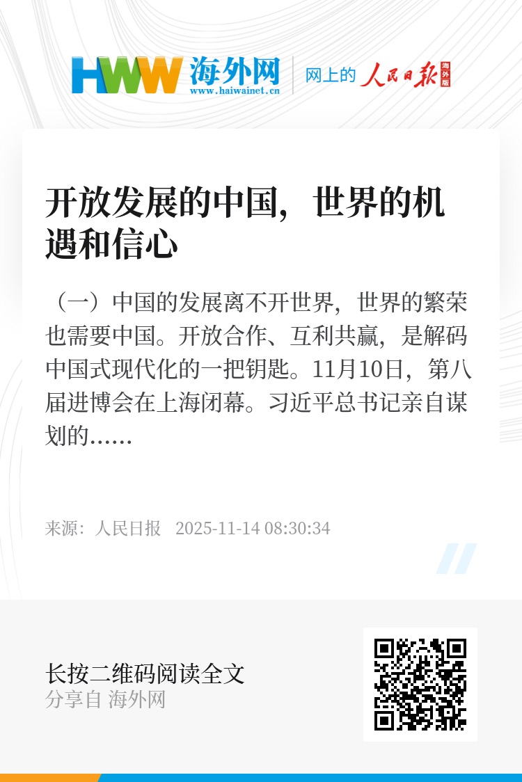 中国坚持“做更好的自己,同世界各国分享发展机遇”。诺贝尔经济学奖获得者托马斯·萨金特表示:“中国的经验实际上已经告诉世界,只有开放,才能帮助建立一个稳定、可预期的新秩序,让所有人能够受益。”
