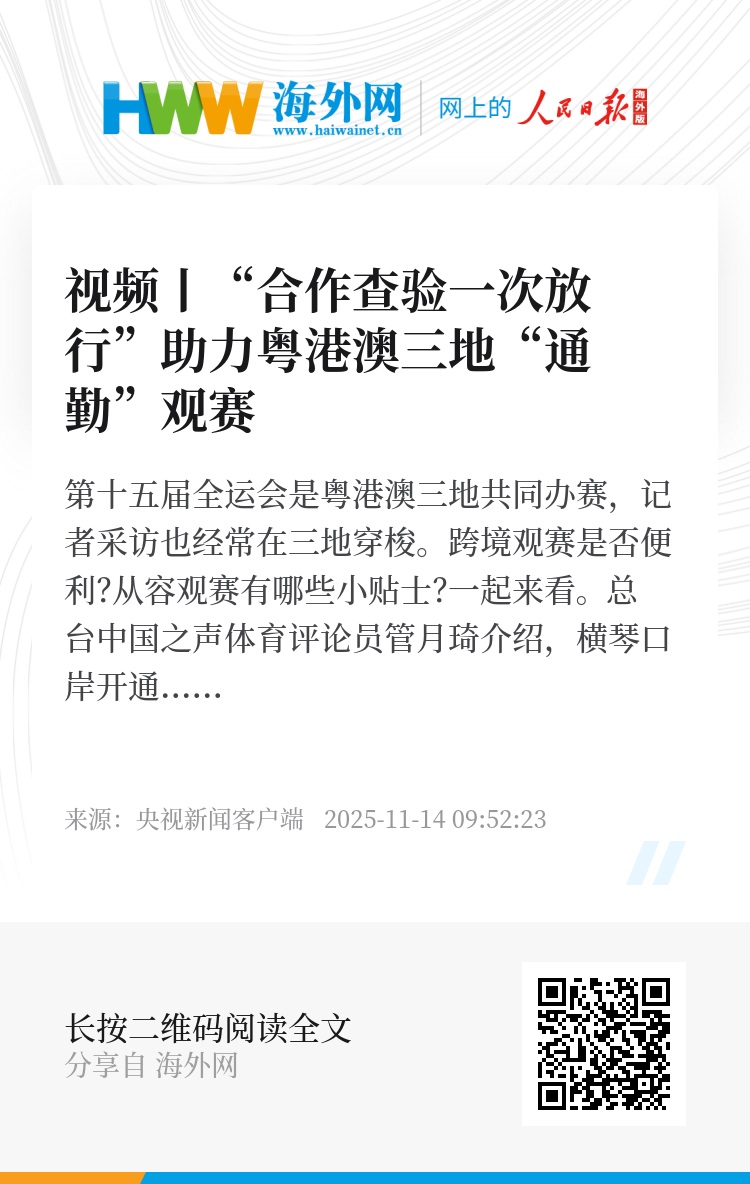 总台中国之声体育评论员管月琦介绍,横琴口岸开通了“全运会专用通道”,为运动健儿们快速通关保驾护航。澳门赛区这次要举办不少热门赛事,现在持有“琴澳旅游团”和“一签多行”签注的旅客,可经横琴口岸多次往返澳门和横琴。