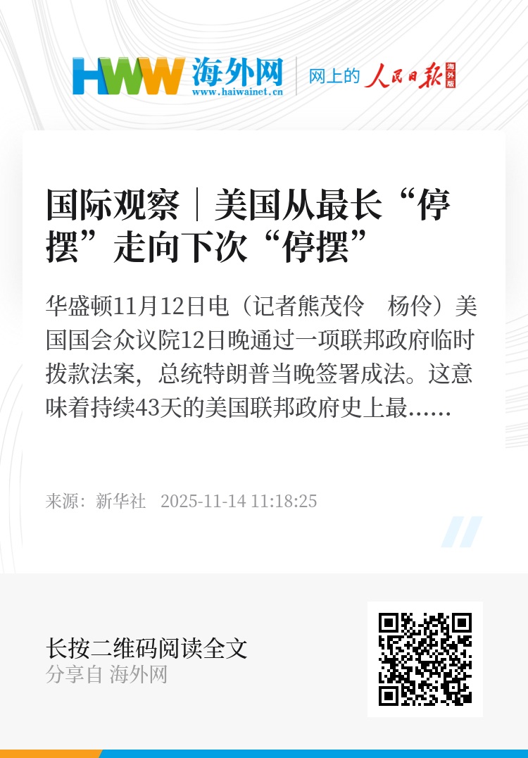 有分析人士认为,美国联邦政府频繁“停摆”且一再刷新纪录,从表象上看是两党在具体政策上的分歧所致,症结在于制度缺陷,根源在于治理失序。