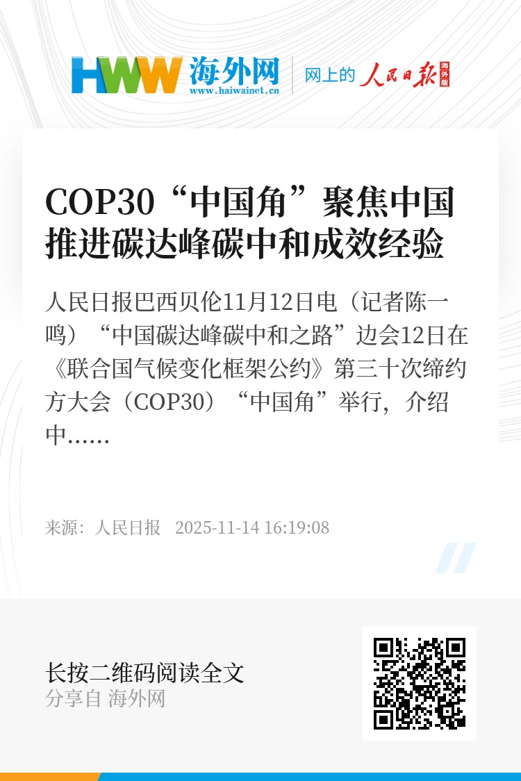 人民日报巴西贝伦11月12日电(记者陈一鸣)“中国碳达峰碳中和之路”边会12日在《联合国气候变化框架公约》第三十次缔约方大会(COP30)“中国角”举行,介绍中国推进碳达峰碳中和的成效和经验,展现中国推动实现“双碳”目标的坚定决心与务实行动。