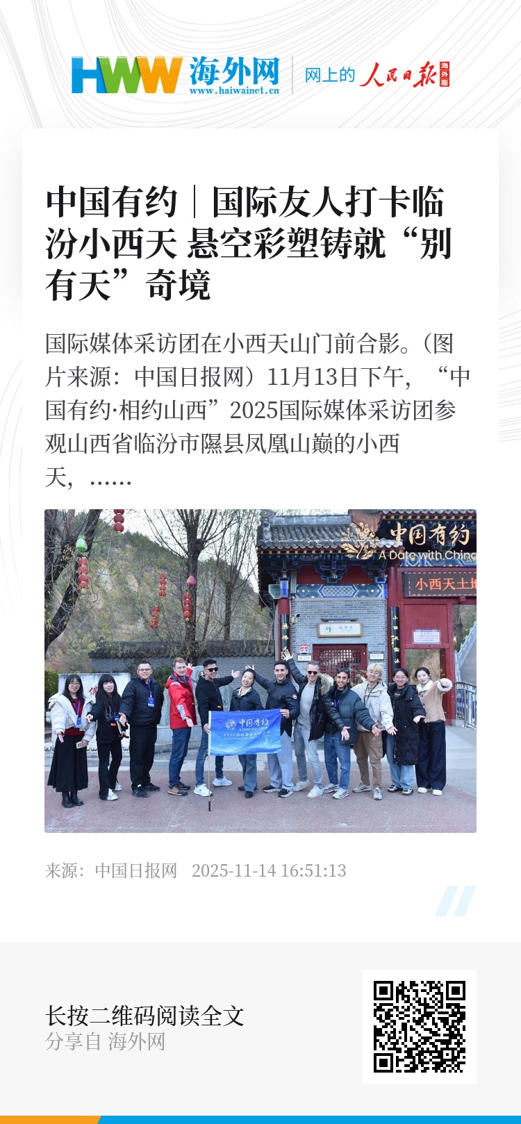 11月13日下午,“中国有约·相约山西”2025国际媒体采访团参观山西省临汾市隰县凤凰山巅的小西天,打卡这座吸引无数“天命人”前来探秘的百年古刹。