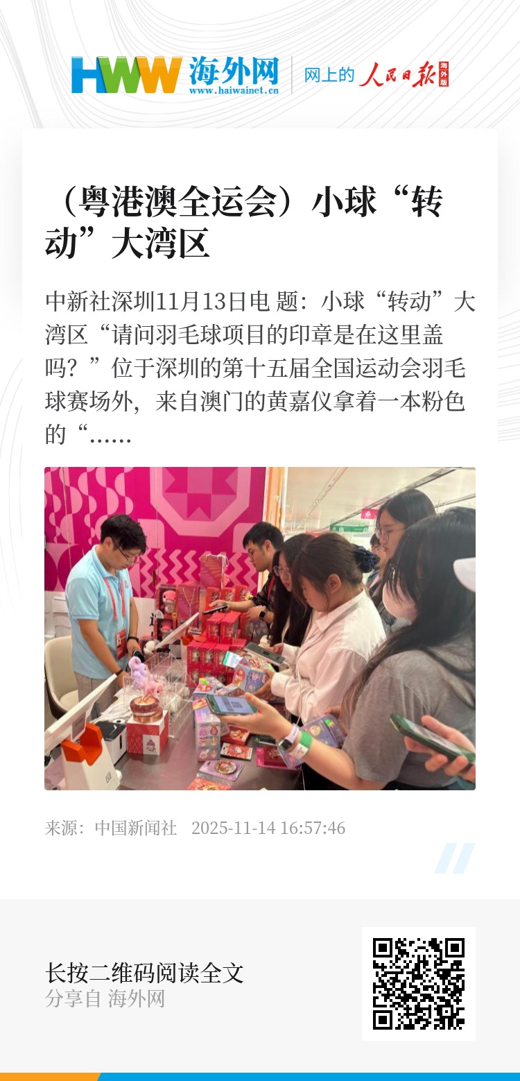 一本满是印章的“全运会护照”、一份精心规划的跨城行程、一组因赛事而跃动的消费数据……这些从羽毛球场馆内外溢出的故事,正是小球“转动”大湾区协同发展的缩影。以全运会为支点,一项项创新举措在此先行先试,为未来的大融合进一步探路。(中新社记者 缪璐)
