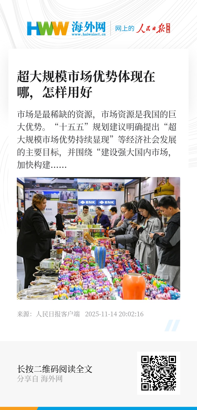 “十五五”规划建议明确提出“超大规模市场优势持续显现”等经济社会发展的主要目标,并围绕“建设强大国内市场,加快构建新发展格局”作出战略部署。