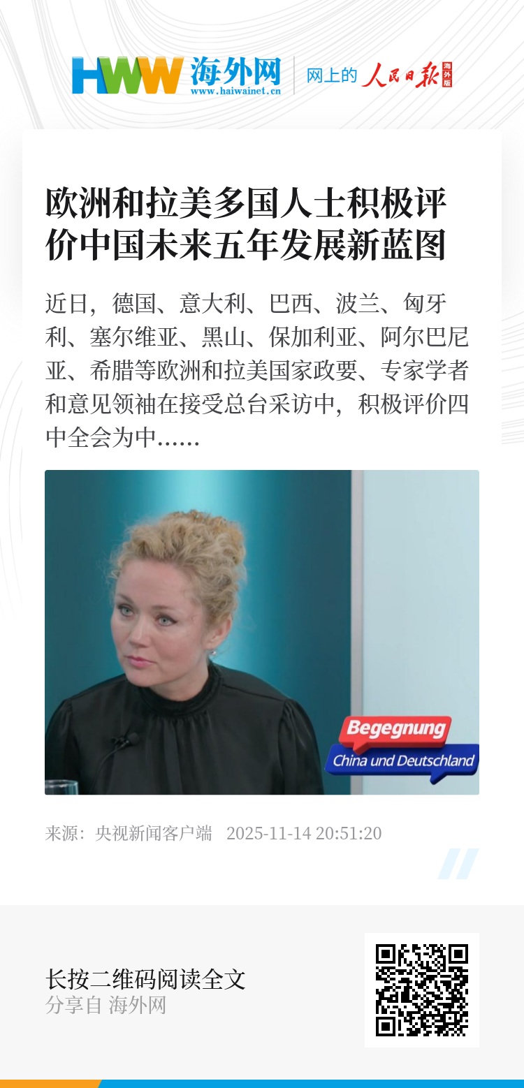 近日,德国、意大利、巴西、波兰、匈牙利、塞尔维亚、黑山、保加利亚、阿尔巴尼亚、希腊等欧洲和拉美国家政要、专家学者和意见领袖在接受总台采访中,积极评价四中全会为中国未来五年发展擘画宏伟蓝图,为全球发展注入更多确定性,期待中国与世界各国共享发展新机遇。