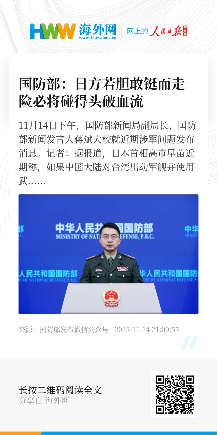 台湾问题纯属中国内政,不容任何外来干涉。今年是中国人民抗日战争暨世界反法西斯战争胜利80周年,也是台湾光复80周年。日方若不深刻汲取历史教训,胆敢铤而走险,甚至武力介入台海局势,必将在中国人民解放军的铜墙铁壁面前碰得头破血流,付出惨痛代价。