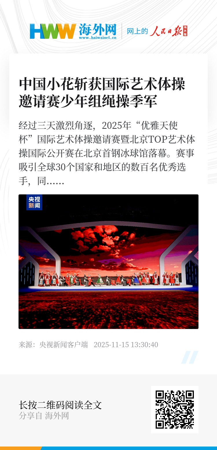 经过三天激烈角逐,2025年“优雅天使杯”国际艺术体操邀请赛暨北京TOP艺术体操国际公开赛在北京首钢冰球馆落幕。赛事吸引全球30个国家和地区的数百名优秀选手,同台演绎艺术体操的力与美,奉献了一场优雅与激情交织的体育盛宴。12岁的中国小花王一朵凭借出色的发挥,斩获少年组绳操季军。
