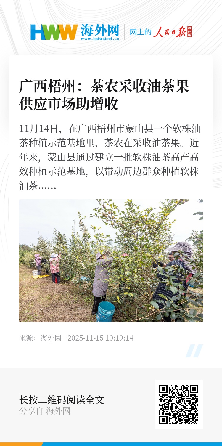 11月14日,在广西梧州市蒙山县一个软株油茶种植示范基地里,茶农在采收油茶果。近年来,蒙山县通过建立一批软株油茶高产高效种植示范基地,以带动周边群众种植软株油茶或进行油茶林品质改造,提高经济效益,助力乡村振兴。(图源:视觉中国)